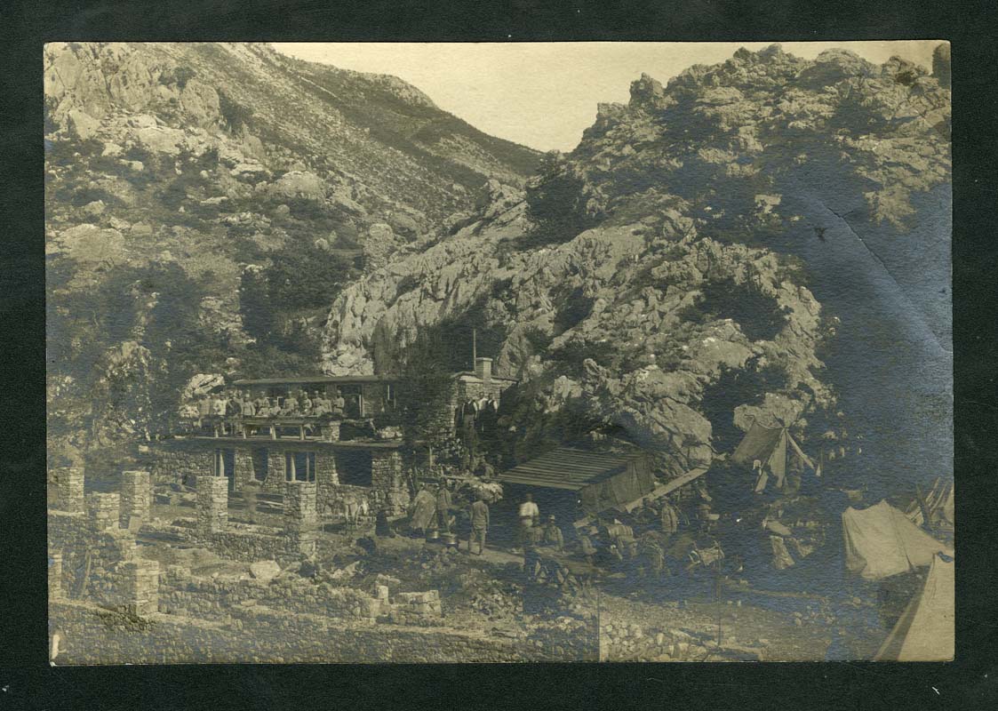 Részlet a Kuk-sattelből. (A Kuk a Lovćen egyik helye, ezzel szemben van Kuk-sattel.) A 2. szpf. gy. e. 5. századának táborhelye. Balra az épülő legénységi barakk, az előtt az éppen elkészült tiszti barakk. Pecsét: M.N. Múzeum Könyvtára; Világháború; 730