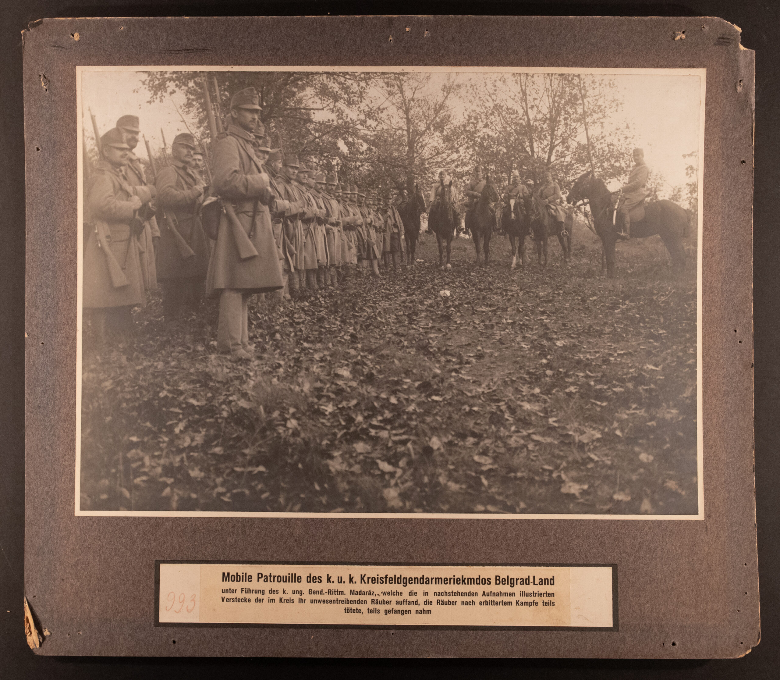 2100/158; 5164; 0738; bélyegző: M. N. Múzeum Könyvtára Világháboru 4359 sz.; N.o. I. Mobilepatrouille des k. u. k. Kreisfeldgend. kdos. Belgrad-Land, des k. ung. Gend. Rittmeister Heinrich Madarász, welche die im n[...] Aufnahmen illustrierten Verstecke der im Kreise ihr unwesen[...] Räuber auffand, die Räuber nach erbittertem Kampfe theils [...] gefangen nahm. Aufnahme des K ung. Gend. rittm. Heinr [...]