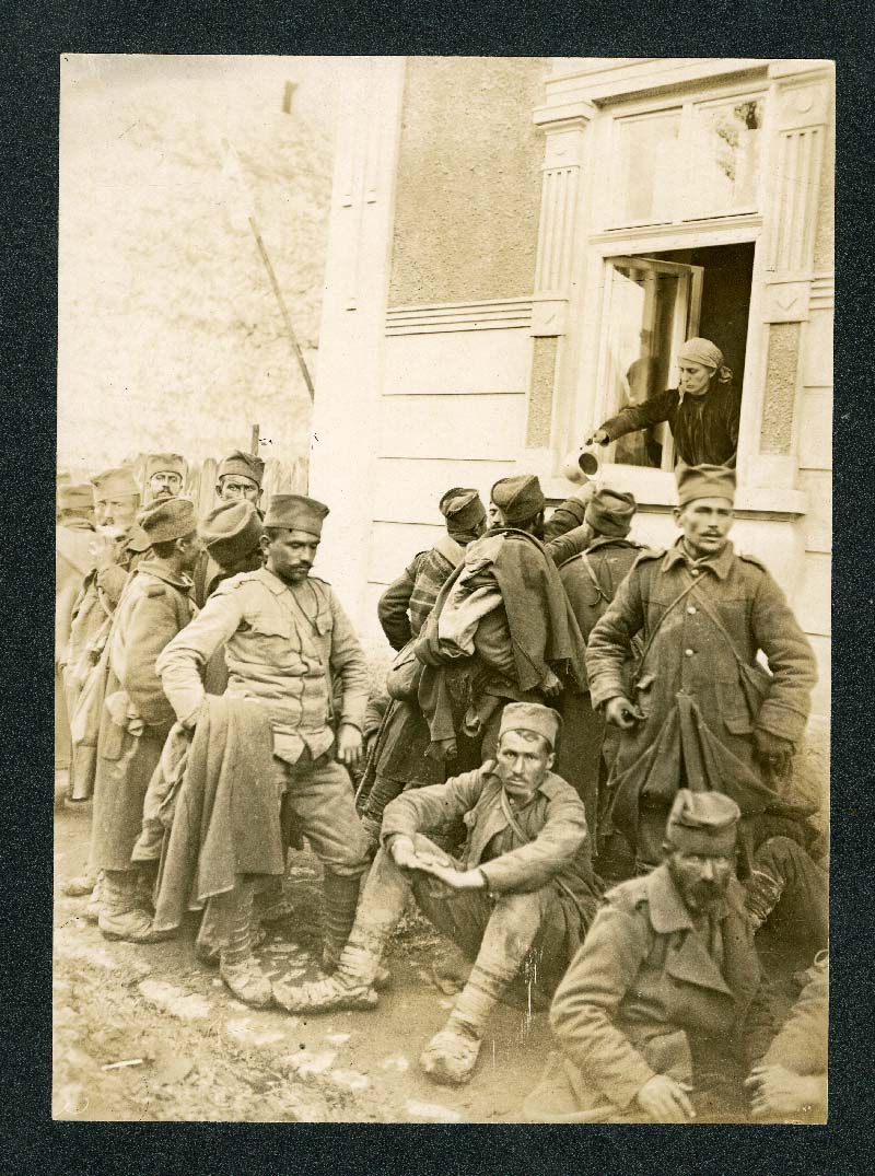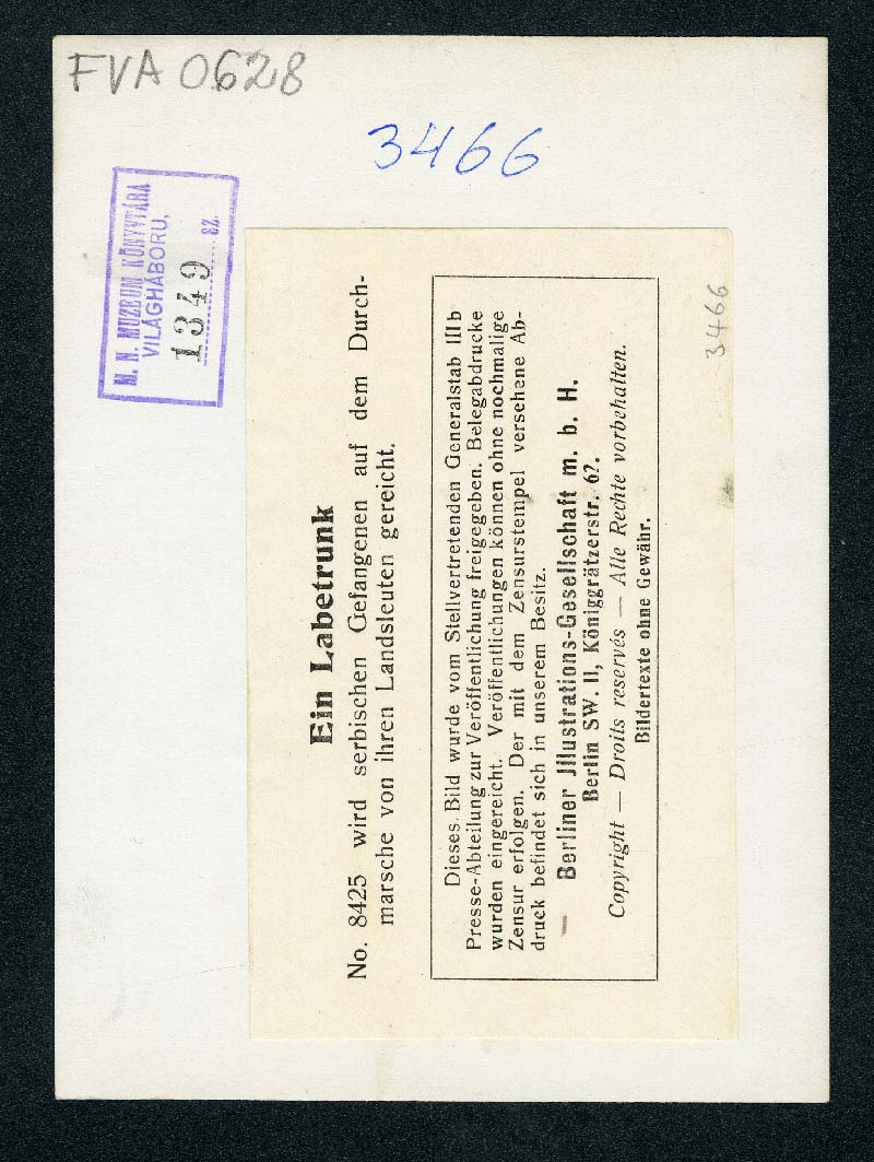 A kép mellé mellékelt papírcédulán szöveg német nyelven: Ein Labetrunk No. 8425 wird serbischen Gefangenen auf dem Durchmarsche von ihren Landsleuten gereicht Berlin illustration bélyegző szövege: Dieses Bild wurde vom Stellvertretenden Generalstab III b Presse-Abteilung zur Veröffentlichung freigegeben. Belegabdrucke wurden eingereicht. Veröffentlichungen können ohne nochmalige Zensur erfolgen. Der mit dem Zensurstempel versehene Abdruck befindet sich in unserem Besitz. Berliner Illustrations-Gesellschaft m. b. H Berlin SW. II, Königgrätzerstr. 62. Copyright—Droits reservés—Alle Rechte vorbehalten Bildertexte ohne Gewähr