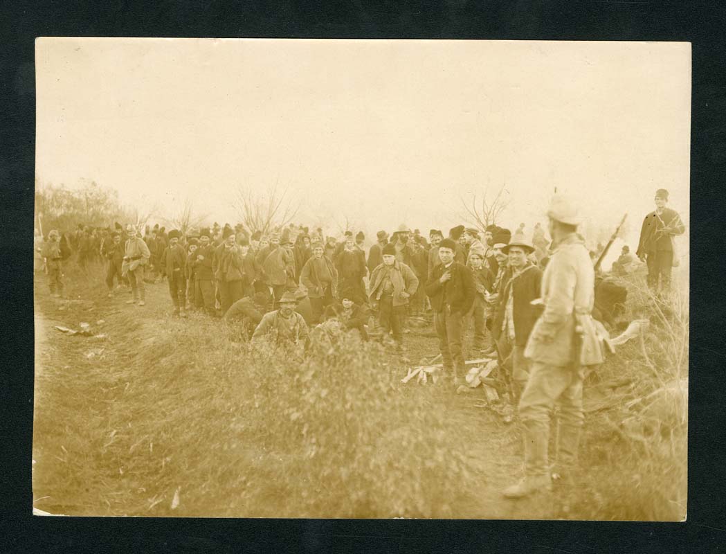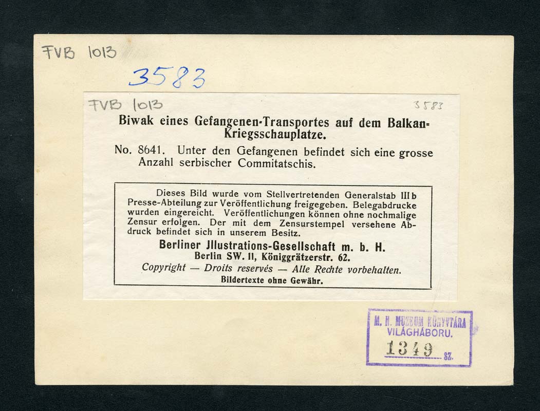 A kép mellé mellékelt papírcédulán szöveg német nyelven: Biwak eines Gefangenen-Transportes auf dem Balkan-Kriegsschauplatze. No. 8641. Unter den Gefangenen befindet sich eine grosse Anzahl serbischer Commitatschis. Bélyegző: Dieses Bild wurde vom Stellvertretenden Generalstab II b Presse-Abteilung zur Veröffentlichung freigegeben. Belegabdrucke wurden eingereicht. Veröffentlichungenkönnen ohne nochmalige Zensur erfolgen. Der mit dem Zensurstempe lversehene Abdruck befindet sich in unserem Besitz. Berliner Illustrations-Gesellschaft m. b. H Berlin SW. II, Königgrätzerstr. 62. Copyright—Droits reservés—Alle Rechte vorbehalten Bildertexte ohne Gewähr