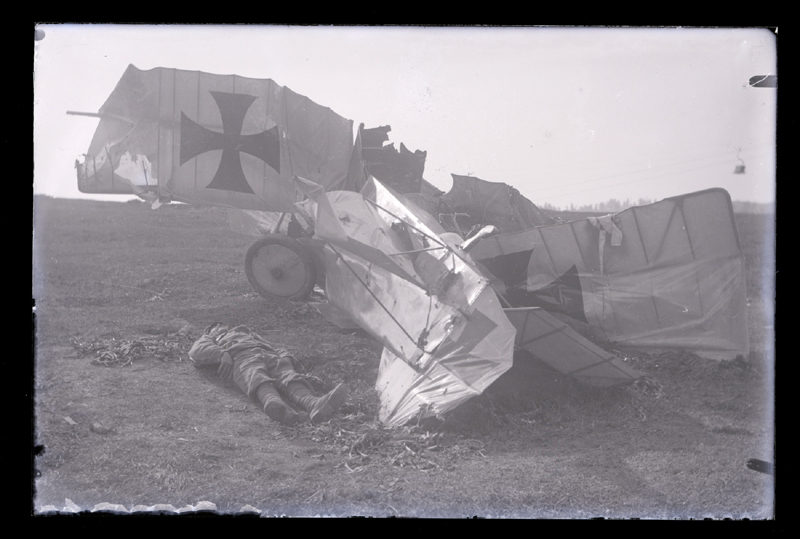Lezuhant katonai repülő a földön fekvő halott katonával