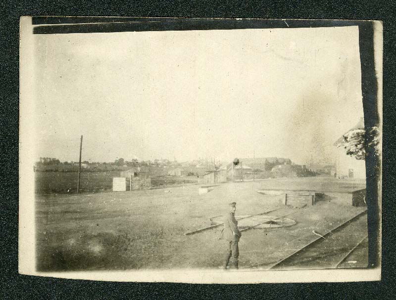 Tájkép katonával és sínekkel, pályaudvarral
