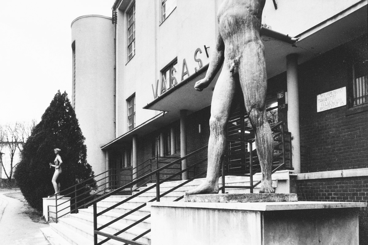 A sporttelep bejáratánál az Atlétanő és a Győztes szobrok Kamotsay István szobrászművész alkotásai (1958).