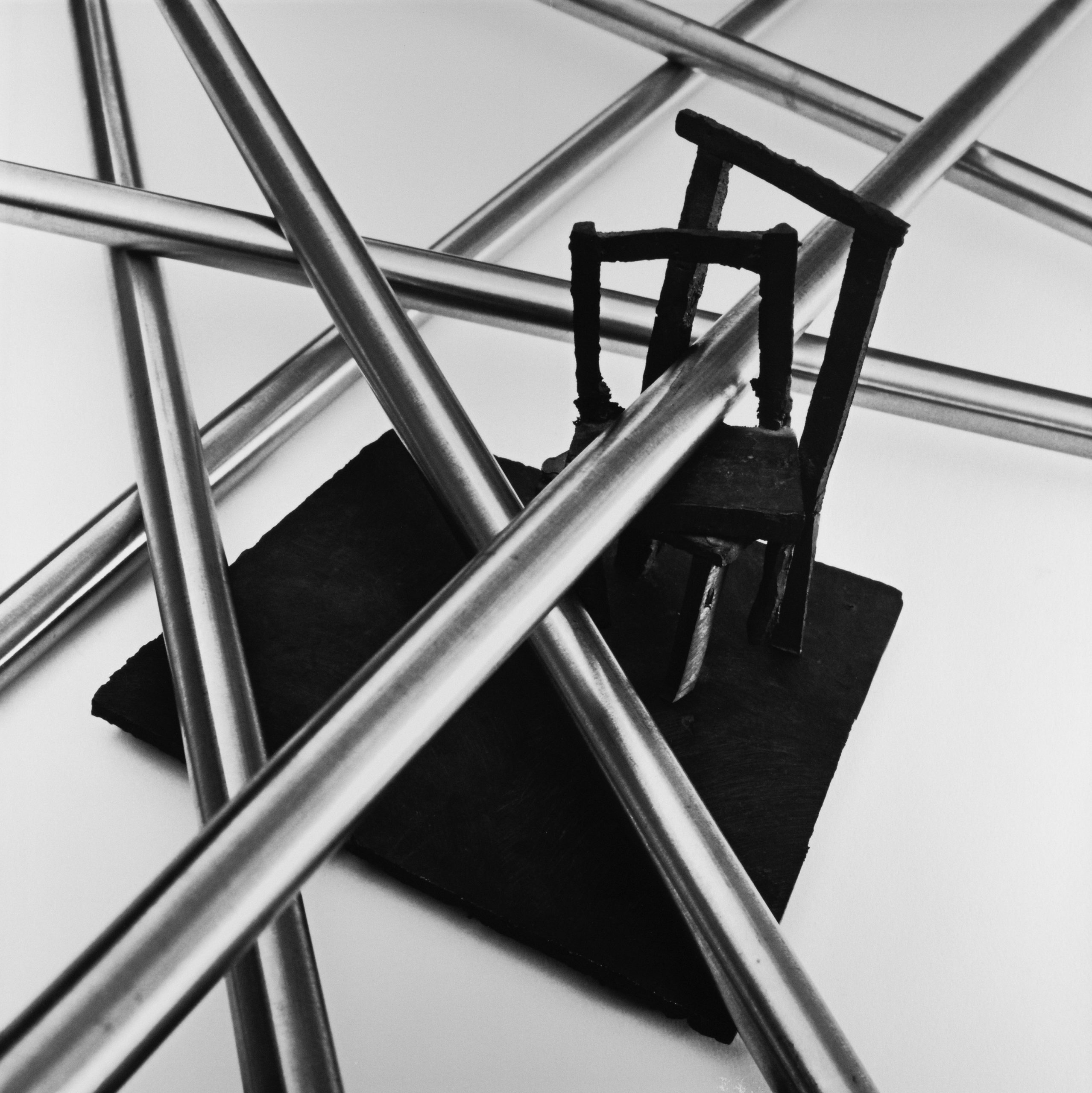 Szobrok, a giacomettisek, a pengevékonyak, a portrék, a fekvősök, a székek, a székek magánya, közös, reménytelen magánya, a mikró terek, amikhez ha az ember a megfelelő horizontot választva közel hajol, akkor pár pillanat, bent van a szoborban, megnyílnak, megnőnek, mozdulnak a bronz hasáb alakok, ők, akik esetlegesen kószálnak ezekben a szobákban, ahol tükörfalak bizonytalanítják a létet, ahol, egzisztencialista módon gondolkodva, a helyét nem találó ember keres támaszt, ahol a rogyasztott üveg falak, a fenyegetően széle-tört bronz falak jelölik, hogy eddig.