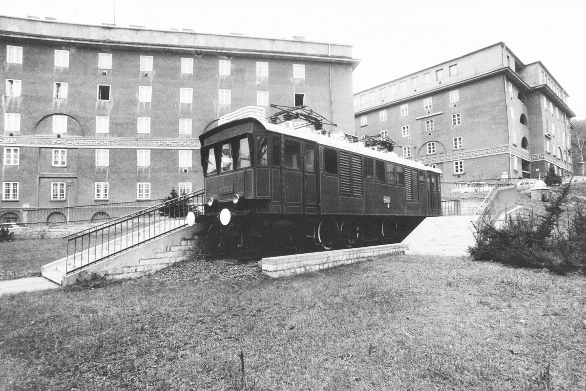 V60 003 Kandó-mozdony a műszaki főiskola óbudai épülete előtt