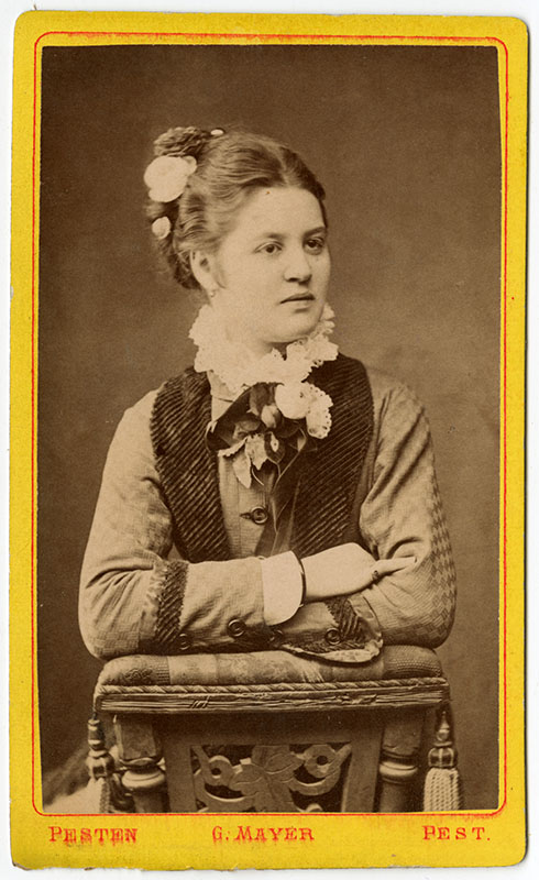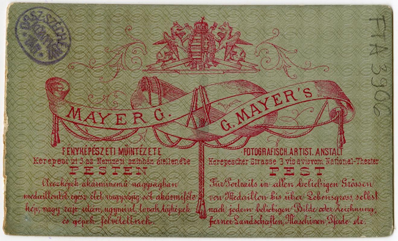 Mayer G. Fényképészeti műintézete Kerepesti ut 3 sz Nemzeti színház átellenébe Pesten. Arczképek akárminemű nagyságban medaillontól egész élet nagyságig sőt akármiféle kép, vagy rajz után, ugymint lovak tájképek és gépek felvétettnek. G. Mayer's Fotografisch. Artist. Anstalt Kerepescher Strasse 3 vis a vis von National Theater Pest. Für Portraits in allen beliebigen Grössen von Medaiilon bis über Lebensgros, selbst nach jedem beliebigen Bilda oder Zeichnung,