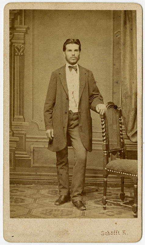 [Gulyás családi album]. [s.l.] : [s.n.], [s.a.]. [13] t., 27x21 cm. 50 albumin papírkép másodlagos hordozón (FTA 3882-3919, FTB 815-826). Sötétbordó teljes bőrborítású album, aranyozott metszéssel, rézcsattal. Kötéstáblái domborítással, sárgaréz verettel díszítettek.