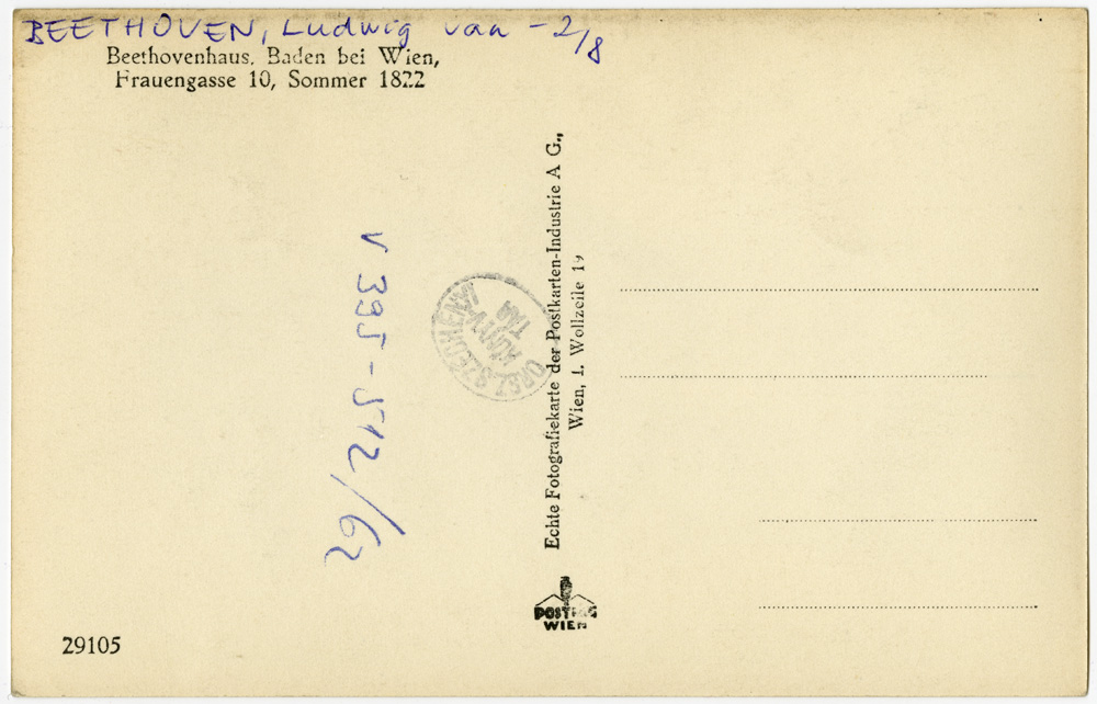 Beethovenhaus. Baden bei Wien, Frauengasse 10, Sommer 1822. Echte Fotografiekarte der Postkarten-Industrie A G., Wien, I. Wollzeile 19.