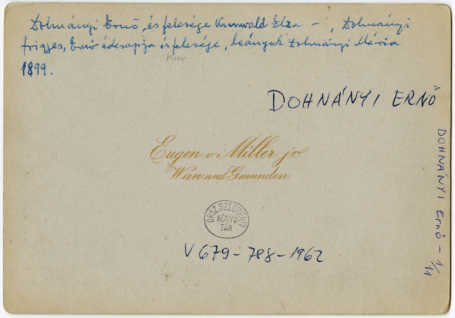 Nyomtatva: Eugen v. Miller jr. Wien und Gmunden. Kézírással: Dohnányi Ernő és felesége Kunwald Elza - Dohnányi Frigyes Ernő édesapja és felesége, leányuk Dohnányi Mária. V.679-788-1962.