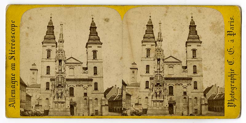 Charles Gaudin francia fényképész felvétele kiemelkedő fotótörténeti szempontból, mivel a legelső ismert sztereófotó a belvárosi plébániatemplomról, ennélfogva kuriózumnak számít. A két darab enyhén foltos albumin fénykép várostörténeti értékét tükrözi, hogy a Halbig András bécsi szobrász által 1863-ban készített Szentháromság oszlop még megtalálható volt a templom előterében, lebontására végül 1881-ben kerítettek csak sort. A fénykép keletkezése 1864–65-re datálható, tehát abból a korszakból származik, amikor Budapest egyesítése előtt még átmeneti állapotok uralkodtak a fővárosban, a tudatos városrendezési koncepciók pedig még nem számolták fel a városképhez szervesen kapcsolódó épületeket