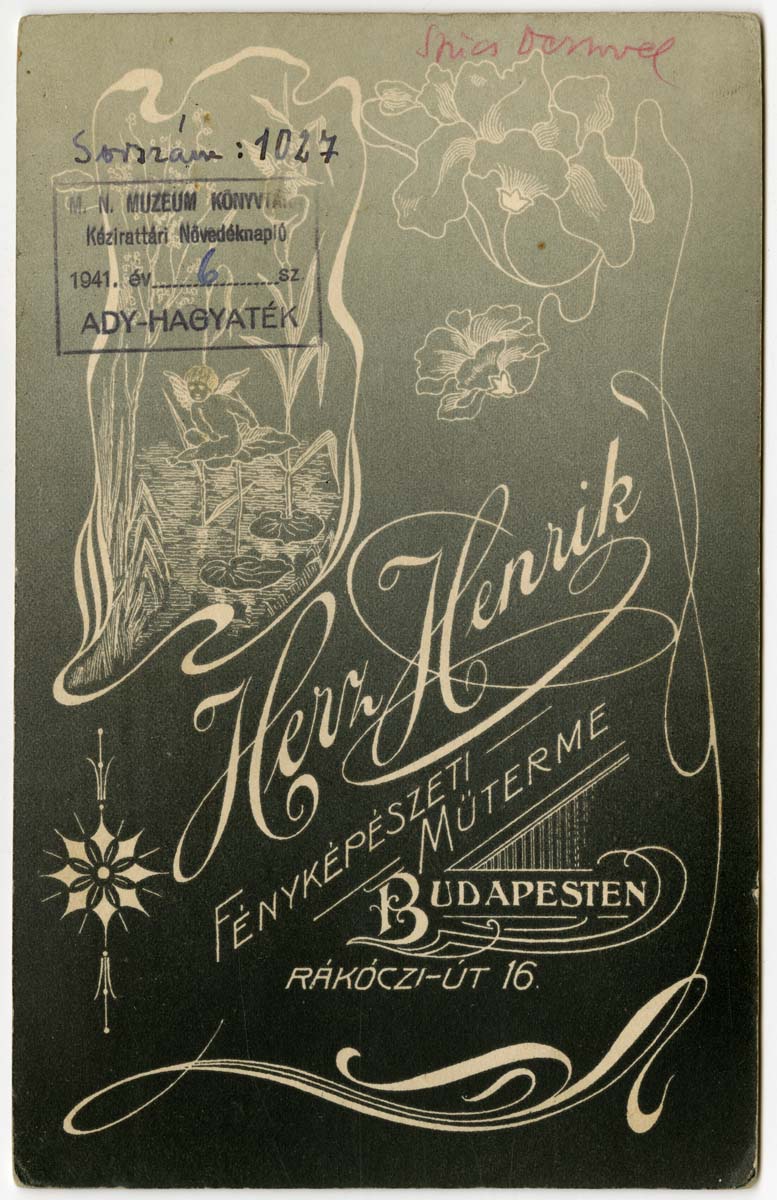 Kézírással: Szűcs Dezsővel. Sorszám: 1027. Nyomtatva: Herz Henrik fényképészeti Műterme Budapesten Rákóczi-út 16. Bélyegző: M. N. Muzeum Könyvtára Kézirattári Növedéknapló 1941. év 6. sz. Ady-hagyaték
