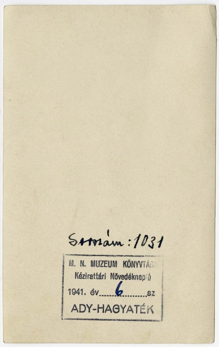 Sorszám: 1031. Bélyegző: M. N. Muzeum Könyvtára Kézirattári Növedéknapló 1941. év 6. sz. Ady-hagyaték