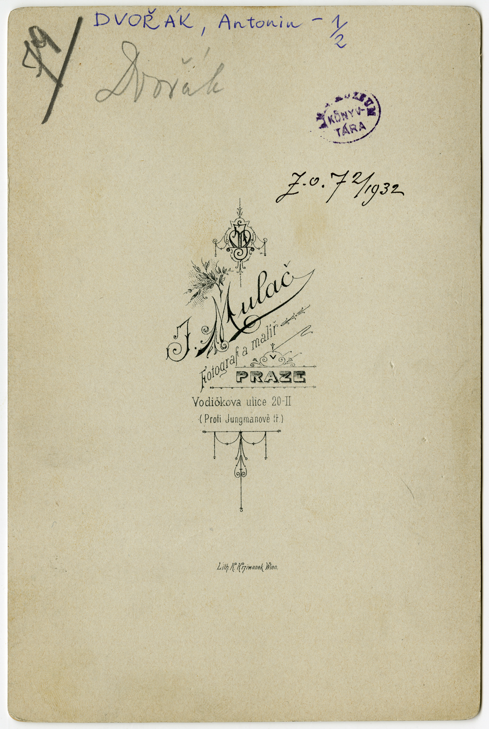 Nyomtatva: J. Mulač Fotografi a malír Praze. Vodiŏkova ulice 20-II. (Proti Jungmanovĕ tř). Lith K. Kriwanek Wien. Z.o.72/1932.