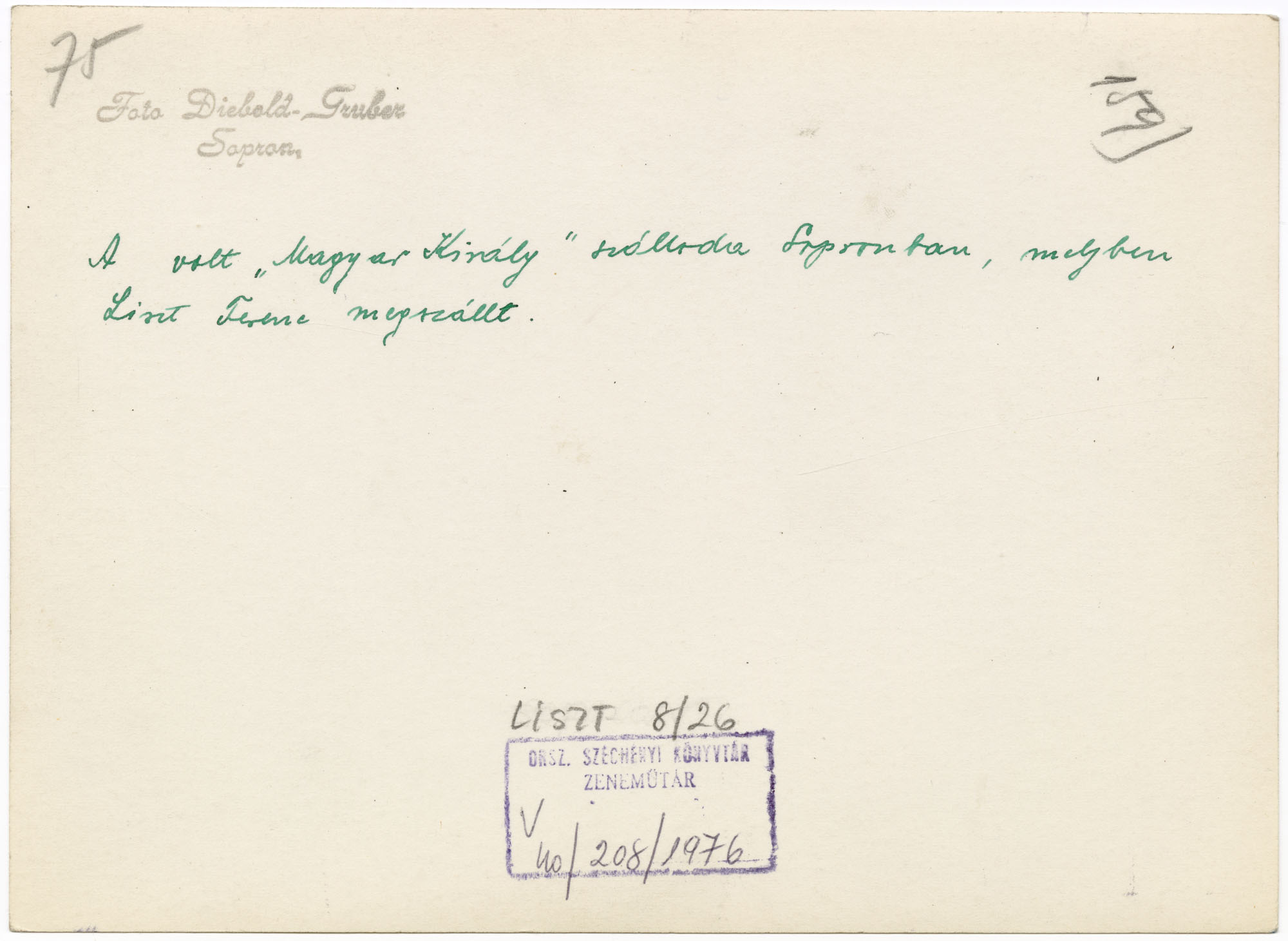 A volt "Magyar Király" szálloda Sopronban, melyben Liszt Ferenc megszállt. 159. Liszt 8/26. Bélyegző: Foto Diebold-Gruber Sopron; Orsz. Széchényi Könyvtár Zeneműtár V 40/208/1976