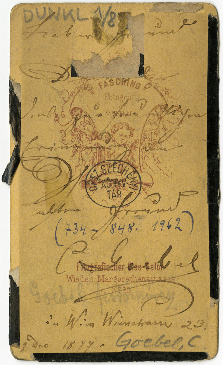 Nyomtatva: Fasching Fotograf in Wien. Fotografischer Glas-salon Wieden, Margarethenstraase. No. 25. Kézírással: Goebel an Wien Wienstrasse 23. 9. dec. 1877. Goebel C. Goebel festőművész.