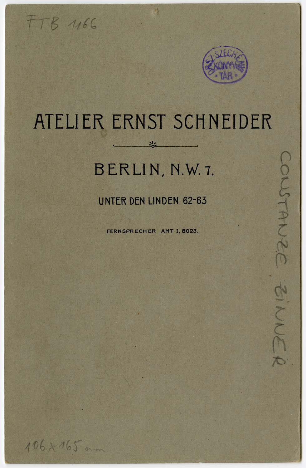 Kézírással: Constanze Zinner. Nyomtatva: Atelier Ernst Schneider / Berlin, N. W. 7. Unter den Linden 62-63. Fernsprecher Amt I, 8023.
