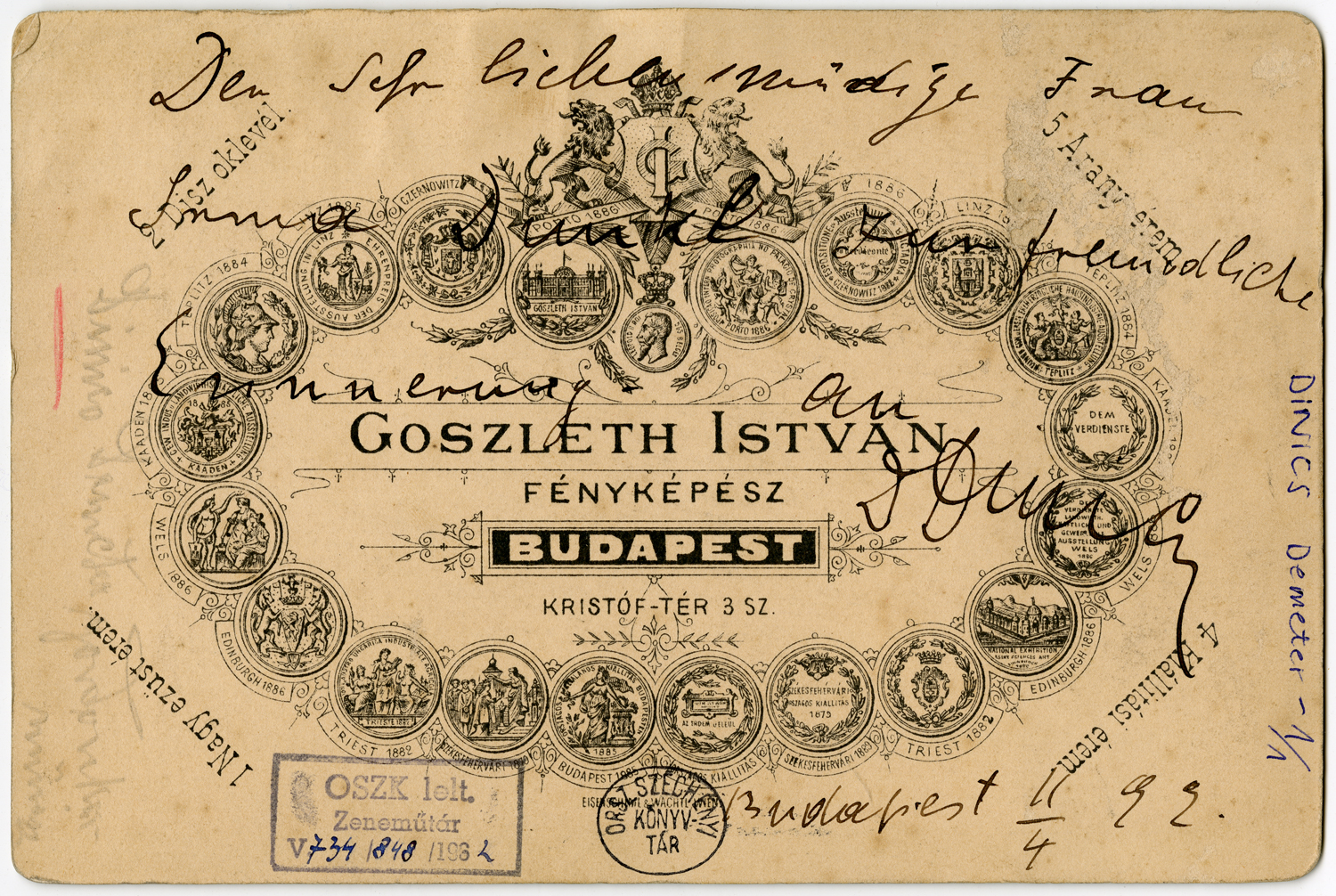 Nyomtatva: Goszleth István fényképész Budapest. Kristóf-tér 3 sz., 2 Díszoklevél, 5 arany érem, 4 kiállítás érem, 1 nagy ezüst érem. Bélyegző: OSZK. lelt. Zeneműtár. V.734/848/1962. Kézírással: Der sehr liebenswürdige frau Irma Dunkl zur freundliche erinnerung an D. Dinics. Budapest 11./4. 99.