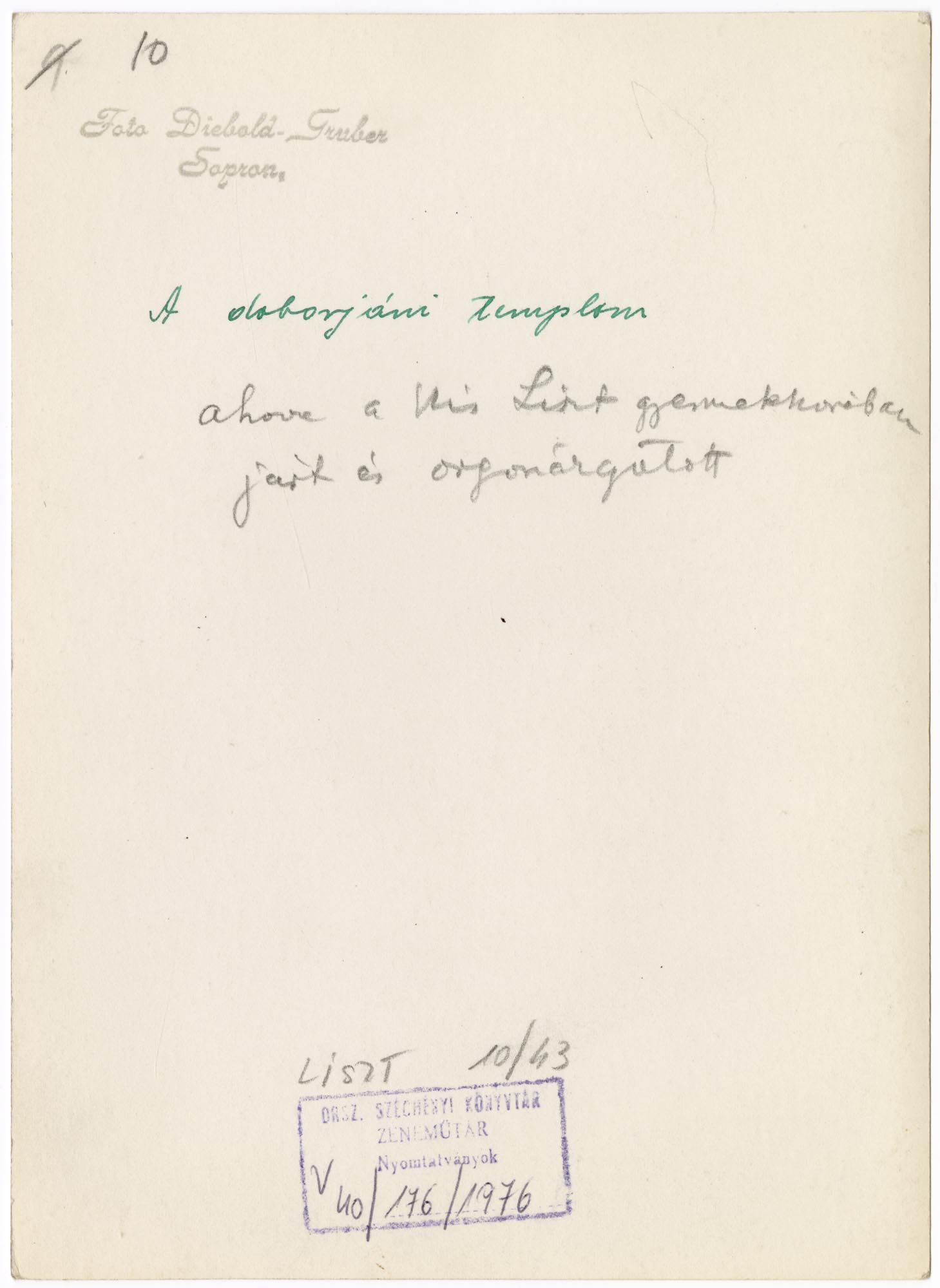 Nyomtatva: Foto Diebold-Gruber Sopron. Kézírással: A doborjáni templom ahova a kis Liszt gyermekkorában járt és orgonázgatott.