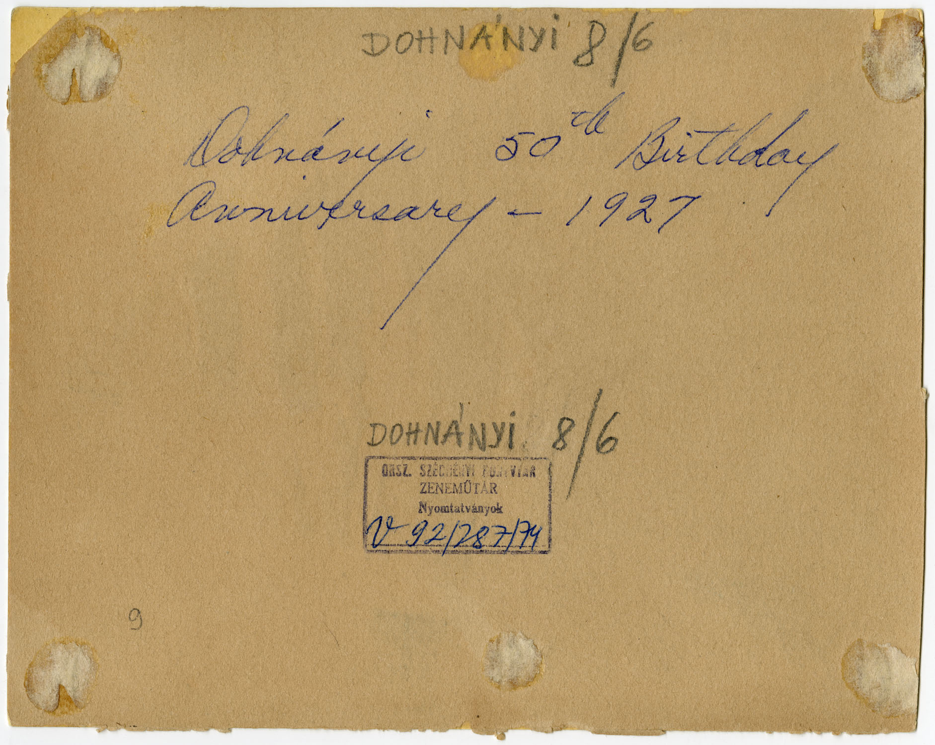 Kézírással: Dohnányi 50 th Birthday anniversary - 1927. Bélyegző: ORSZ. Széchényi Könyvtár zeneműtár. Nyomtatványok. V.92/287/74.