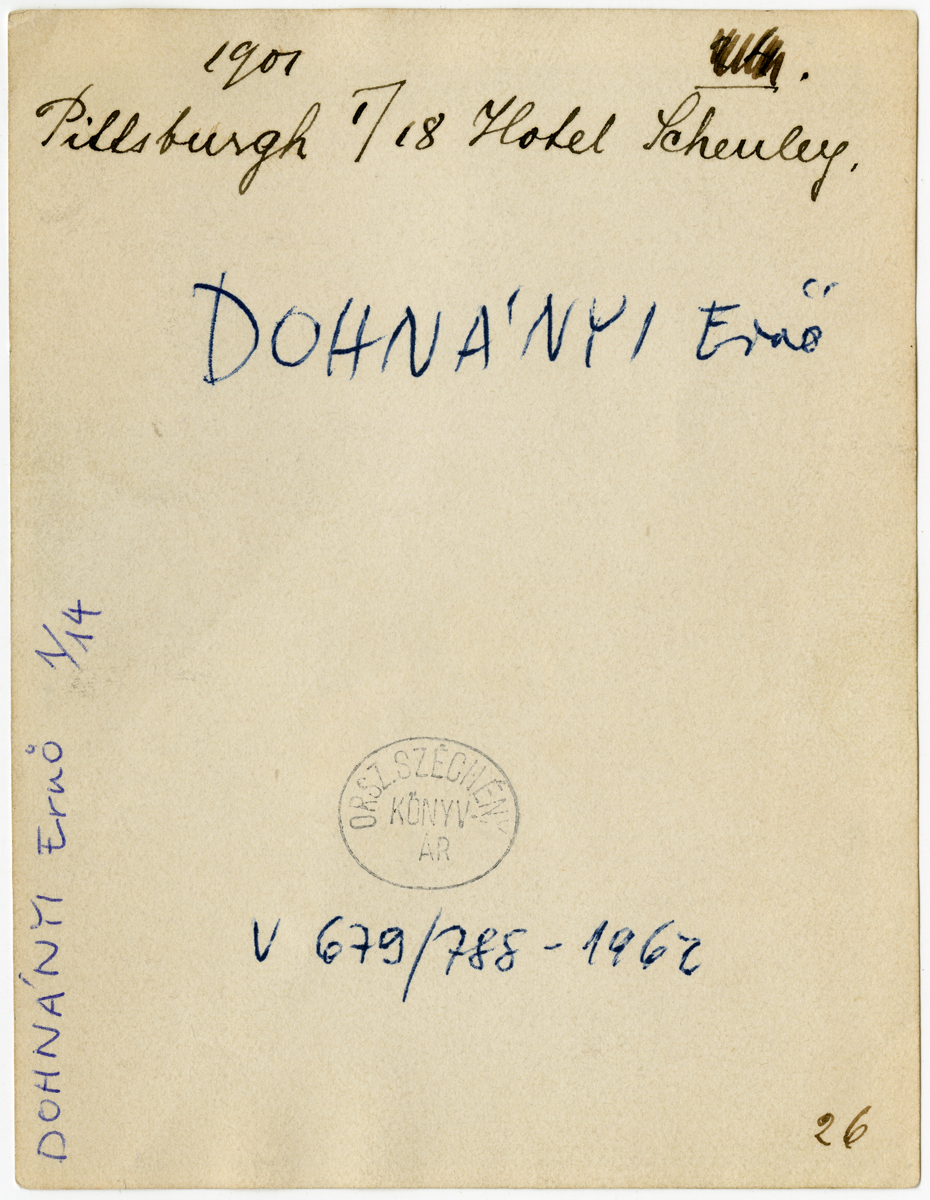 Kézírással: 1901. Pittsburgh. 1/28 Hotel Schenley. Dohnányi Ernő Bélyegző: Orsz. Széchényi Könyvtár. zeneműtár V.679/788-1962.