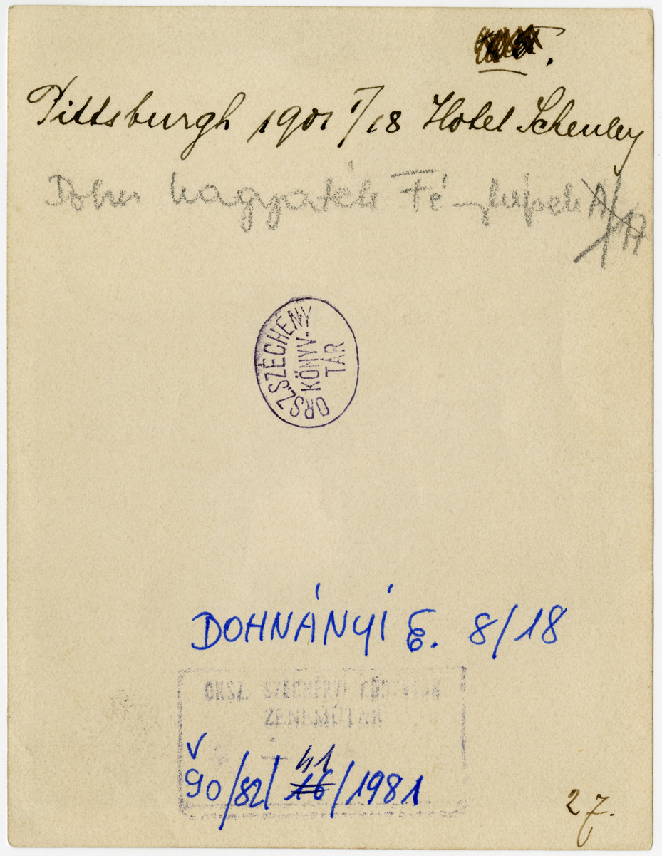 Kézírással: Pittsburgh. 1901. 1/28 Hotel Schenley. Dohn. hagyaték fényképek. Bélyegző: Orsz. Széchényi Könyvtár. zeneműtár V.90/82/41/1981.