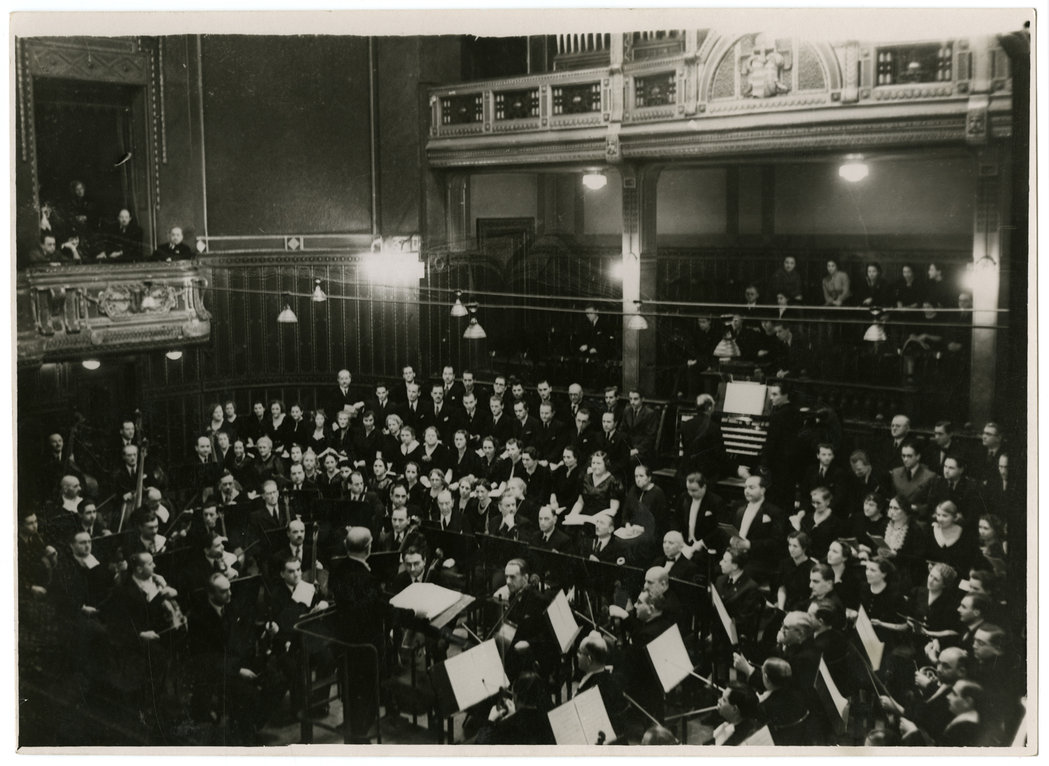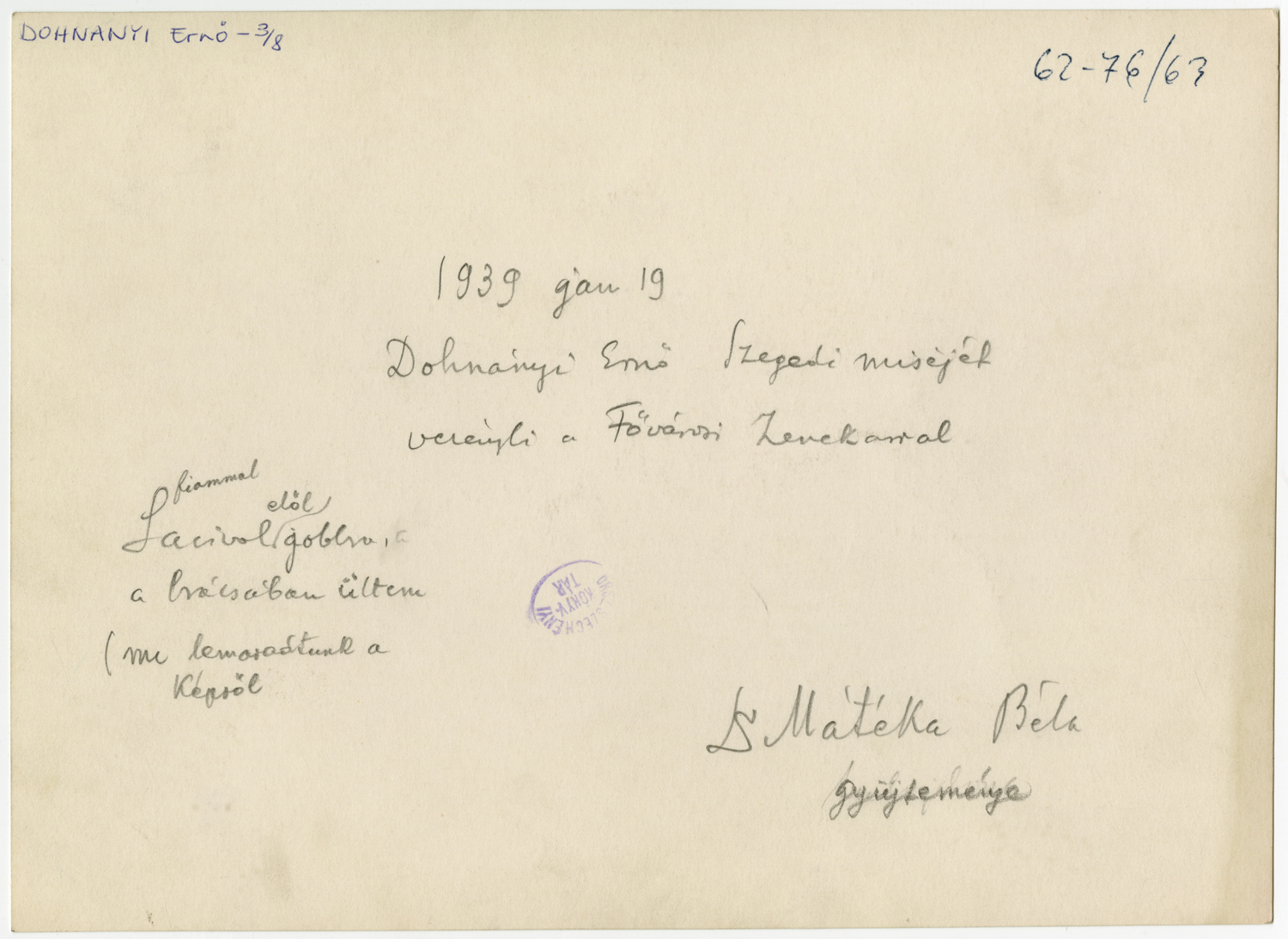 Kézírással: 1939 jan. 19. Dohnányi Ernő Szegedi miséjét vezényli a Fővárosi Zenekarral. Fiammal Lacival elöl jobbra, a brácsában ültem (mi lemosódtunk a képről). Dr. Mátéka Béla gyűjteménye.