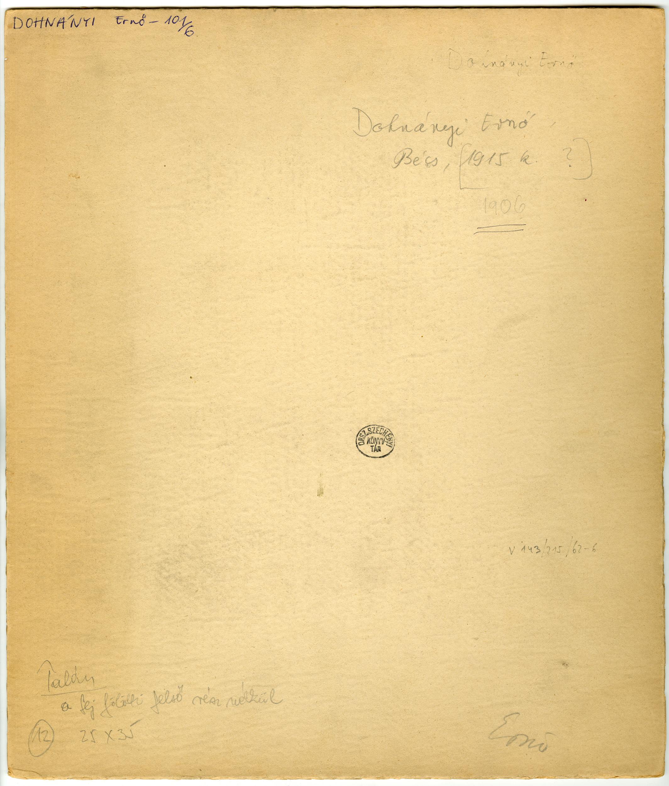 Dohnányi Ernő 101/6. 1906. Dohnányi Ernő, Bécs, 1915. k? 1906. V 143/215/62-6. Talán a fej fölötti felső rész nélkül 25x35; Ernő.