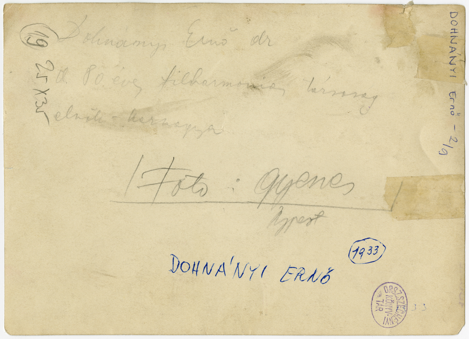 Kézírással: Dohnányi Ernő a 80 éves filharmonia társaság elnök-karnagya. Foto: Gyenes Bpest. 1933.