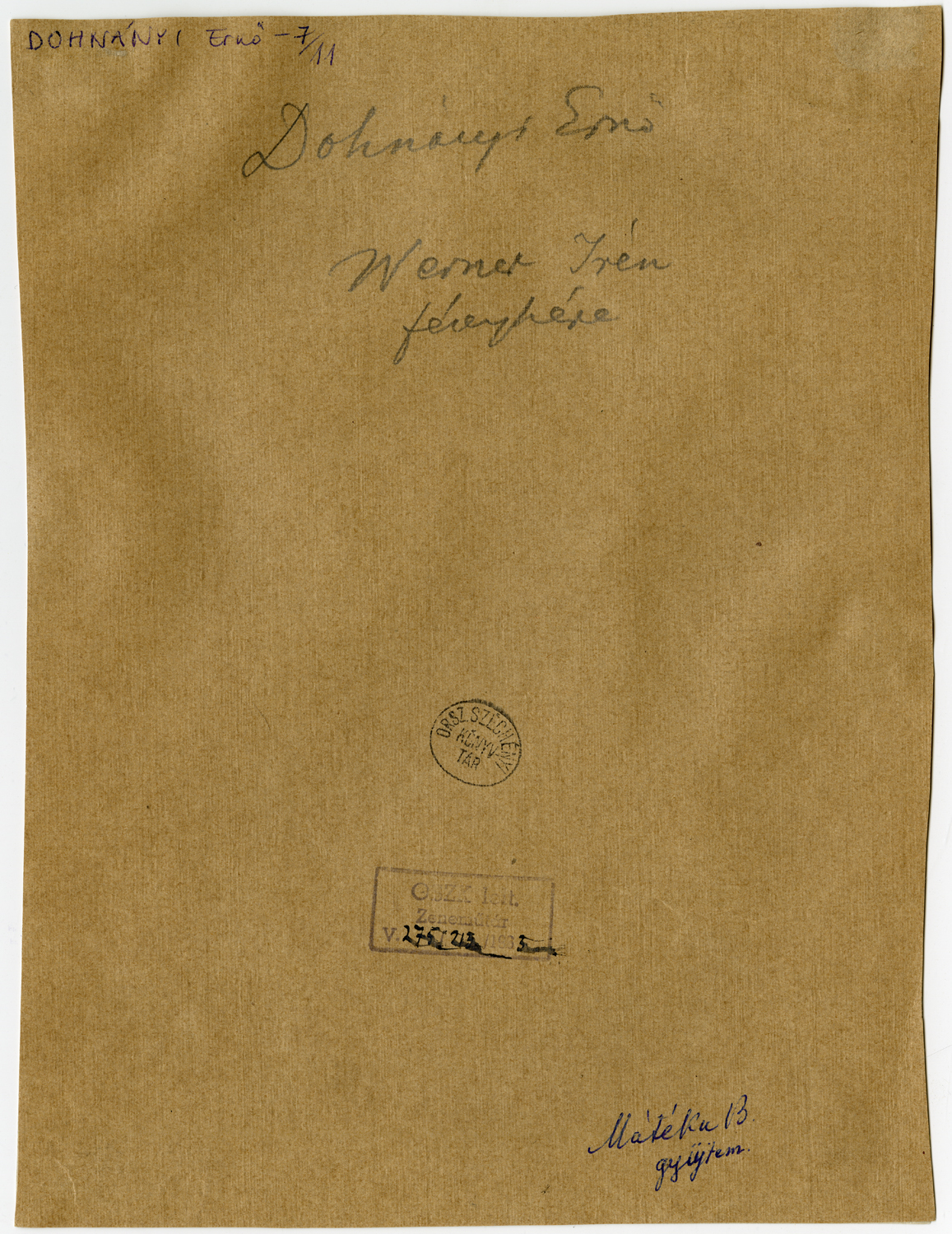 Kézírással: Dohnányi Ernő. Werner Irén fényképe. Mátéka B. gyűjtem. Bélyegző: OSZK. lelt. Zeneműtár V. 275/213/1963.