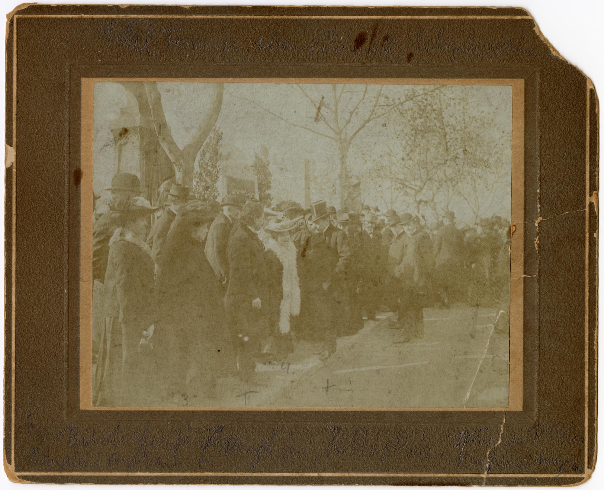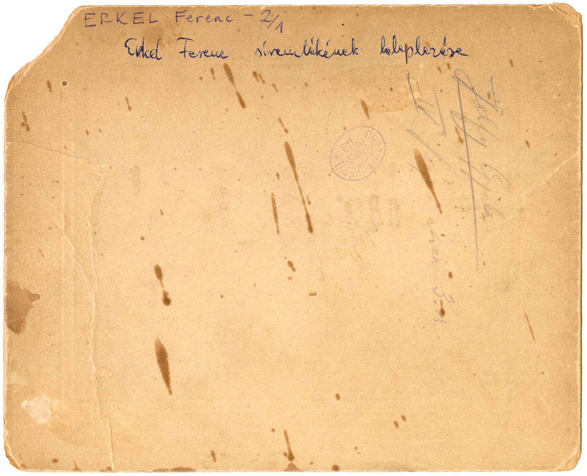 Erkel Ferenc síremlékének leleplezése. Halványan, ceruzával: Jelfy Gyula IV. Szép u. 3. Erkel Ferenc 2/1