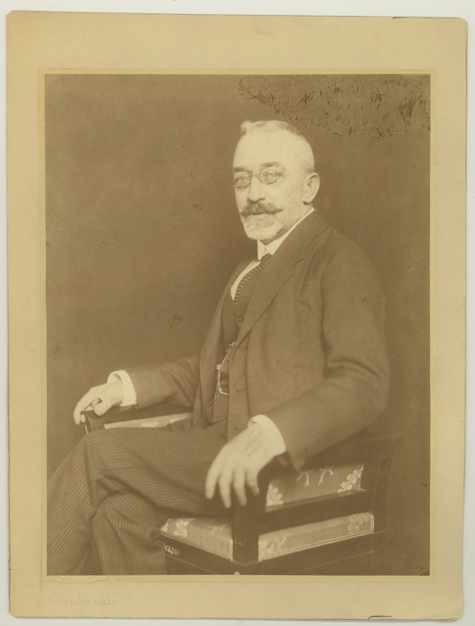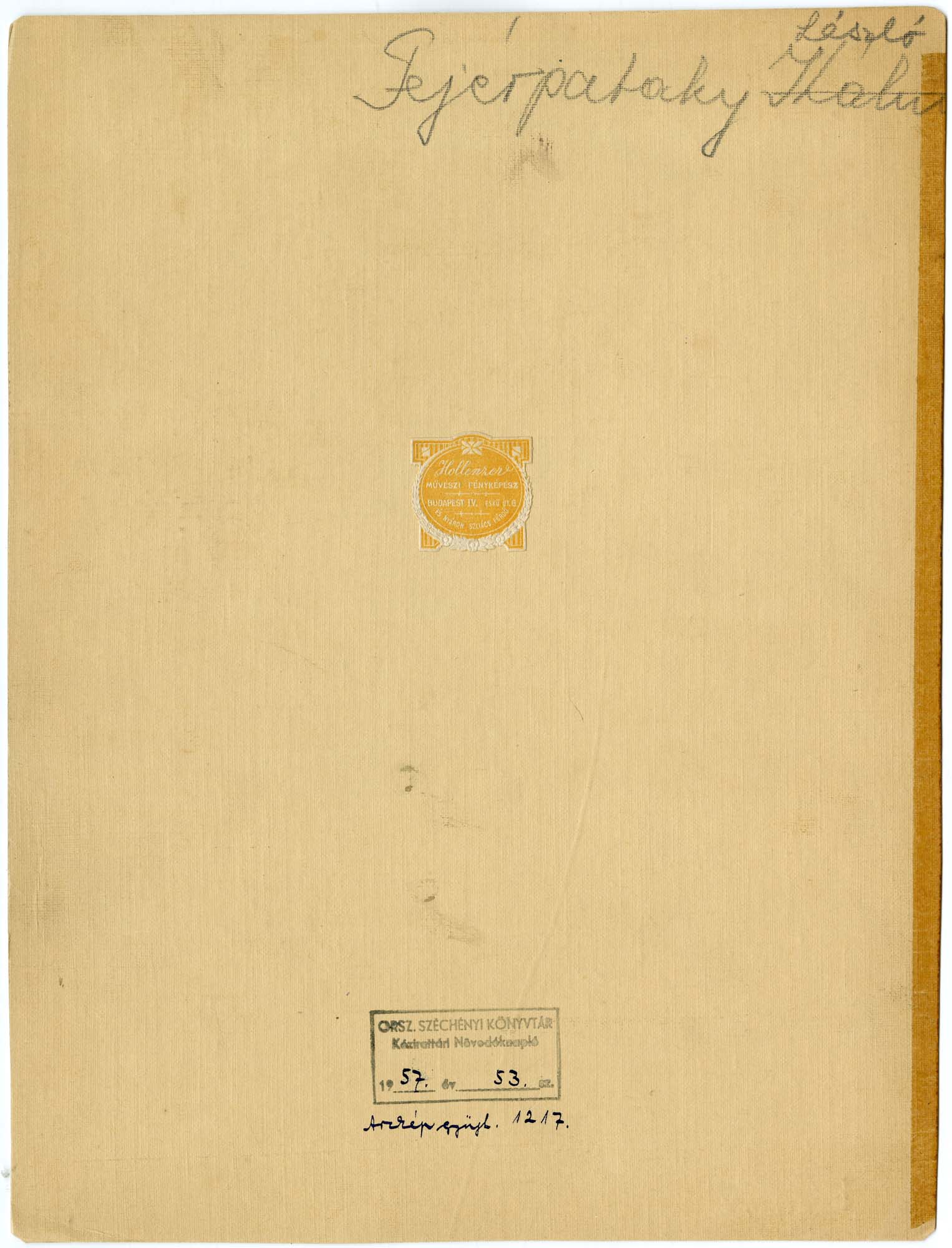 Kézírással: Fejérpataky Kálm[án] (áthúzva) László. Címke: Hollenzer művészi fényképész Budapest IV. Eskü út 6. és nyáron Szliács fürdő