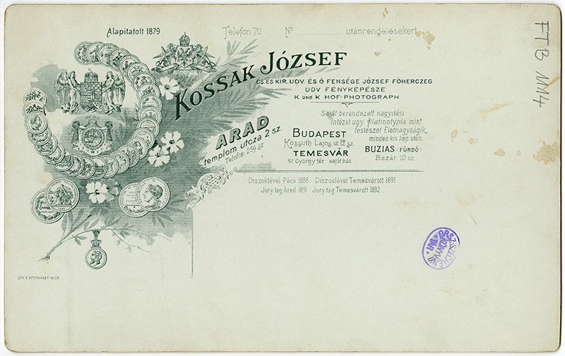 Kossak József cs. és kir. udv. és ő fensége József főherczeg udv. fényképésze K und K Hof-Photograph. Arad Templom utca 2 sz. Telefon 259 sz. Budapest Kossuth Lajos ut 12. sz. Temesvár St György tér saját ház. Buzias(fürdő) Bazár 10. sz. Saját berendezett nagyitási intézet ugy platinotípia mint festészet életnagyságik minden kis kép után. Diszoklevél Pécs 1888. Díszoklevél Temesvárott 1891. Jury tag Arad 1891. Jury tag Temesvárott 1892. Alapítatott 1879