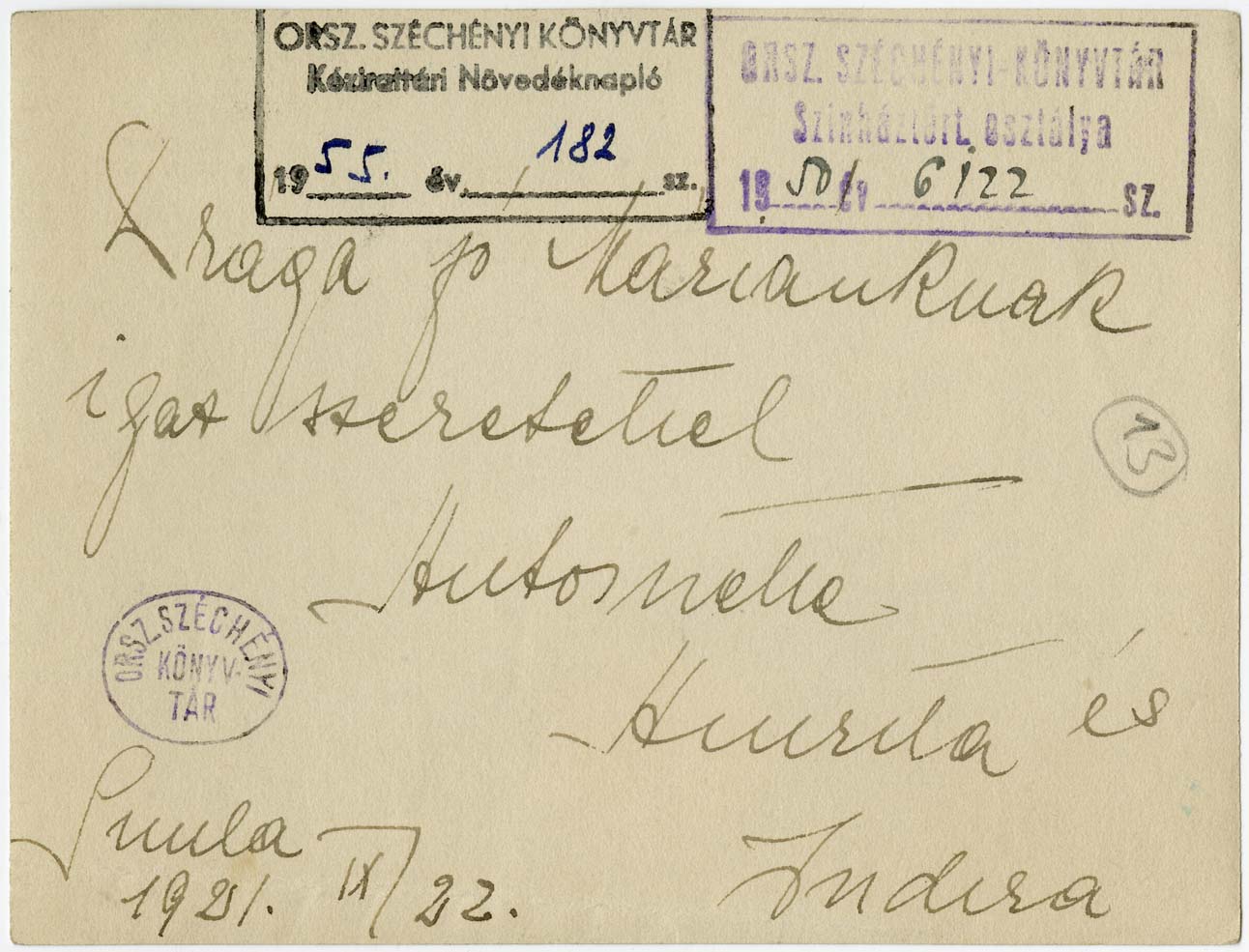 Kézírással: Drága jó Marikánknak igaz szeretettel Antoinette, Amrita és Indira. Simla 1921. IX/22. Bélyegző: Orsz. Széchényi-Könyvtár Színháztört. Osztálya 1950. év 6122. sz; Orsz. Széchényi Könyvtár Kézirattári Növedéknapló 1955. év 182. sz.
