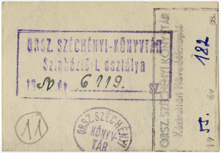 Bélyegző: Orsz. Széchényi-Könyvtár Színháztört. Osztálya 1950. év 6119. sz; Orsz. Széchényi Könyvtár Kézirattári Növedéknapló 1955. év 182. sz.