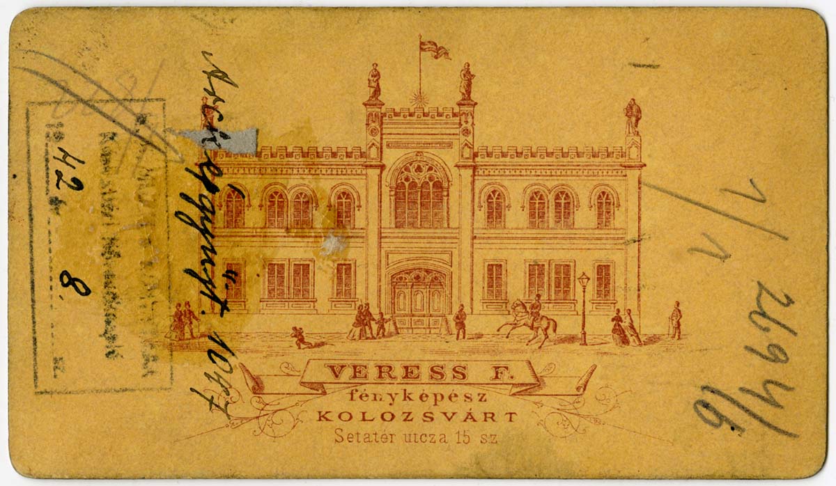 Kézírással: Arcképgyűjt. 1047.; 1/1 2694/6. Nyomtatva: Veress F. fényképész Kolozsvárt Sétatér utcza 15. sz. Bélyegző: M. N. Muzeum Könyvtára Kézirattári Növedéknapló 1942. év. 8. sz.