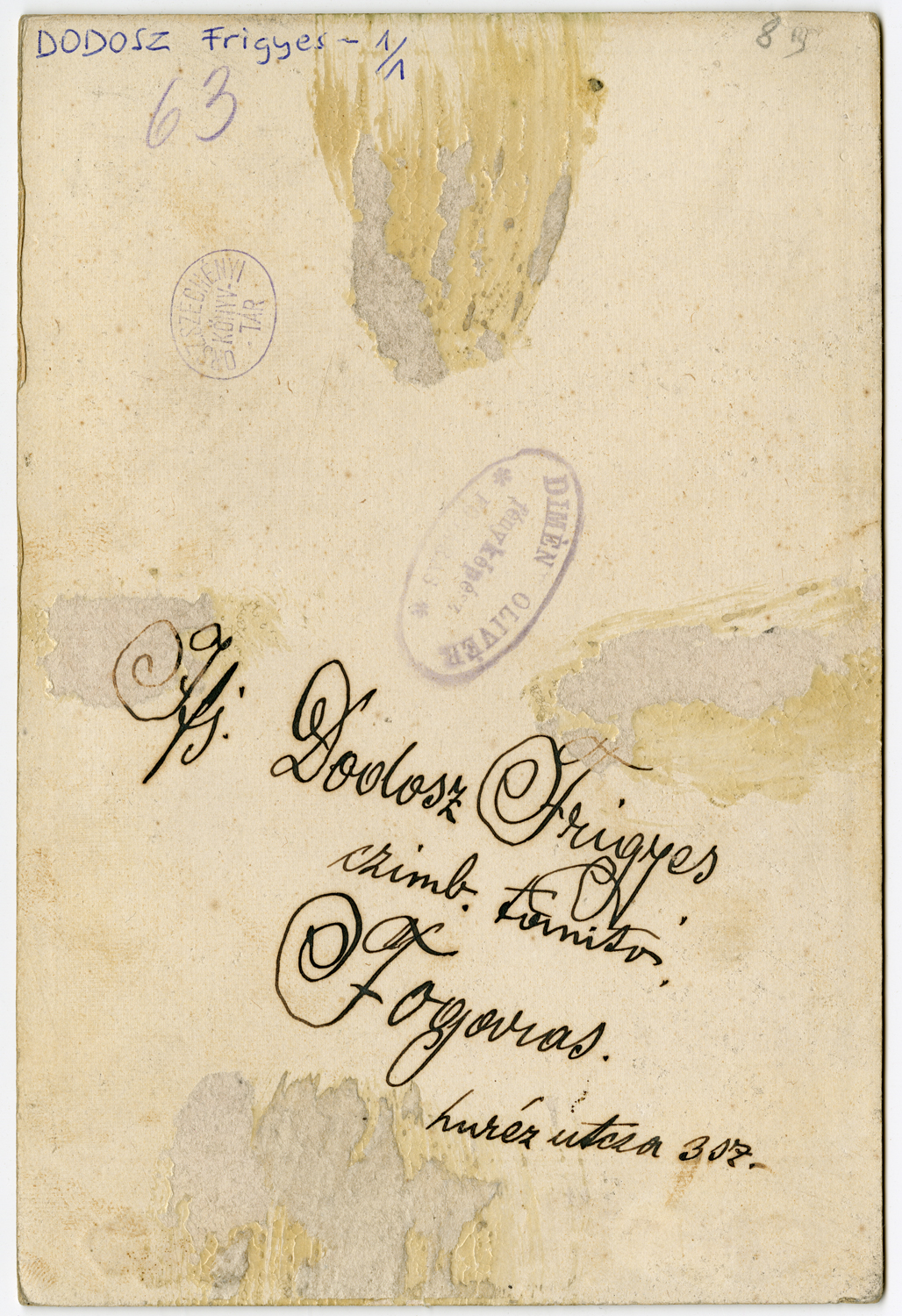 Bélyegző: Dimén Olivér fényképész. Fogaras. Kézírással: Ifj. Dodosz Frigyes czimb. tanitó. Fogaras. Huréz utcza 3 sz.