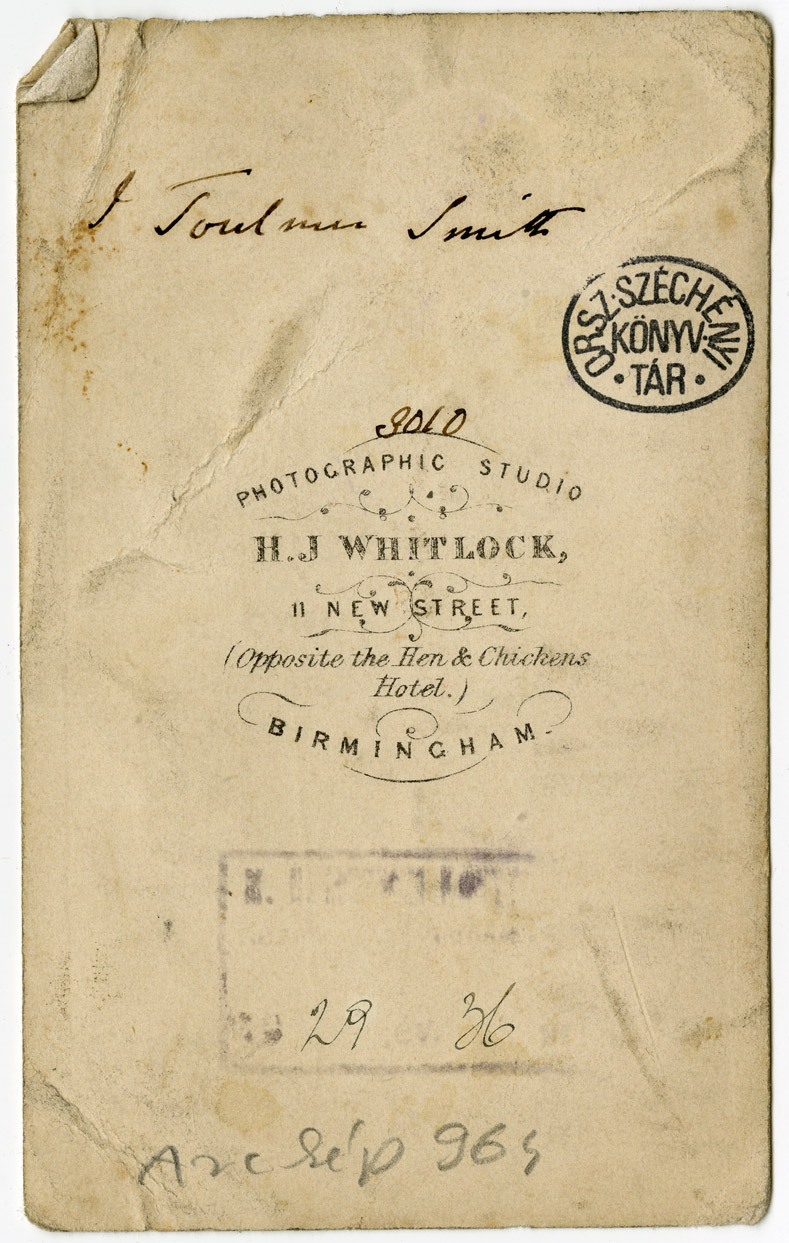 Kézírással: J. Toulmain Smith. Solo(?). Nyomtatva: Photographic Studio H. J. Whitlock, 11, New Street, (Opposite the Hen&Chickens Hotel.) Birmingham. Bélyegző: M. N. Muzeum Könyvtára Kéziratt. Növedéknapló 1929. év 36. sz.