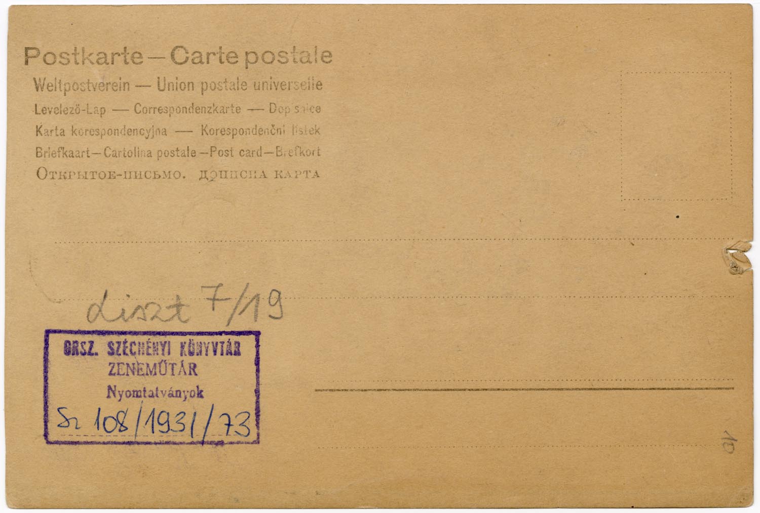 7/19. Postkarte - Carte postale - Weltpostverein - Union postale universelle. Levelező-lap - Correspondenzkarte - Dopisnice - Karta korespondencyjna - Korespondencni listek - Briefkaart - Cartolina postale - Post card - Briefkort. Bélyegző: Orsz. Széchényi Könyvtár Zeneműtár Nyomtatványok Sz 108/1931/73.