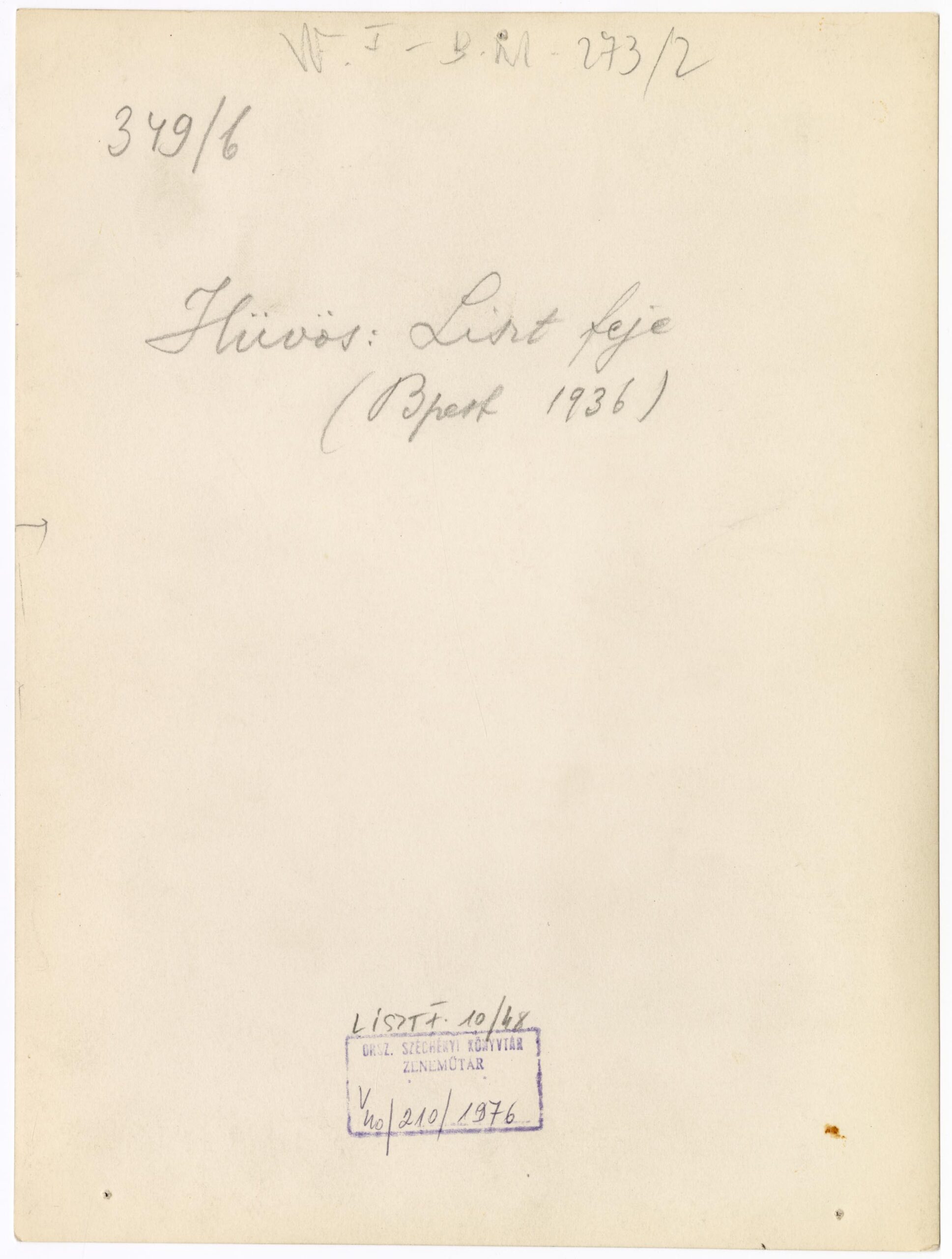 Kézírással: Hüvös: Liszt feje (Bpest. 1936). Bélyegző: Orsz. Széchényi Könyvtár Zeneműtár. V40/210/1976.