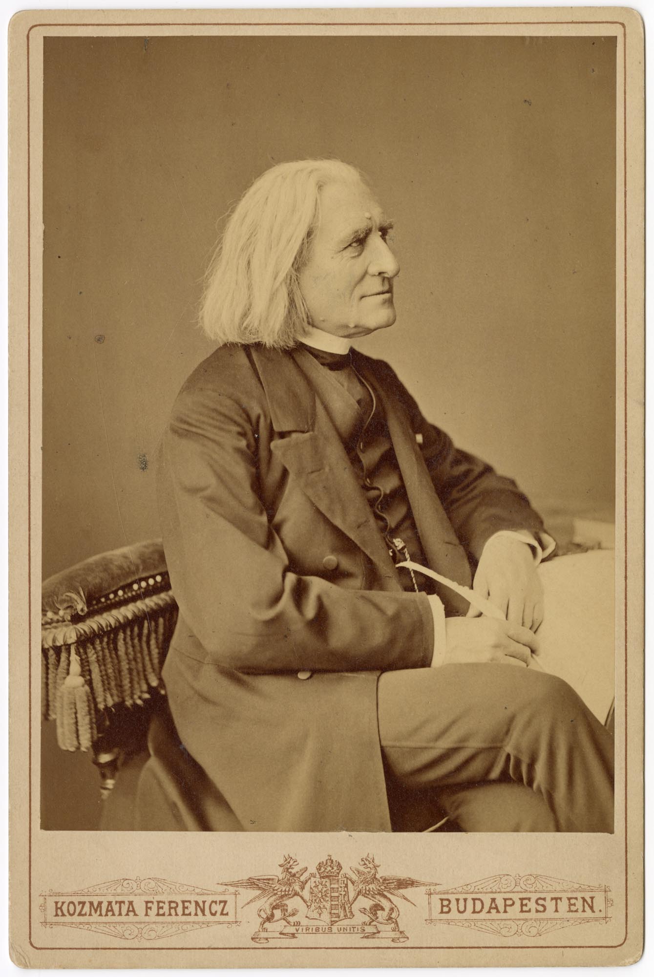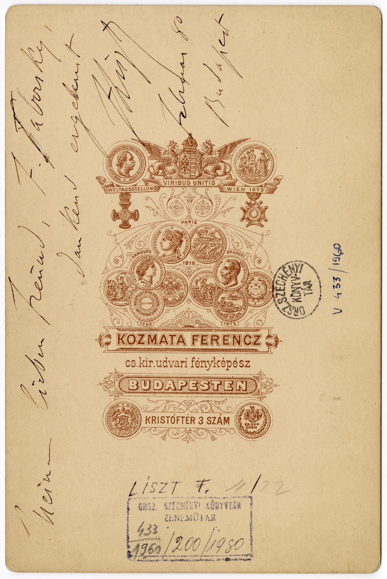 Nyomtatva: Kozmata Ferencz. cs.kir. udvari fényképész Budapesten. Kristóf tér 3 sz. Kézírással: Meine lieben freund J. Taborszky, dankend ergebend(?) F Liszt Februar 80. Budapest. Bélyegző: Orsz. Széchényi Könyvtár. Zeneműtár. 433/1960/200/1980.