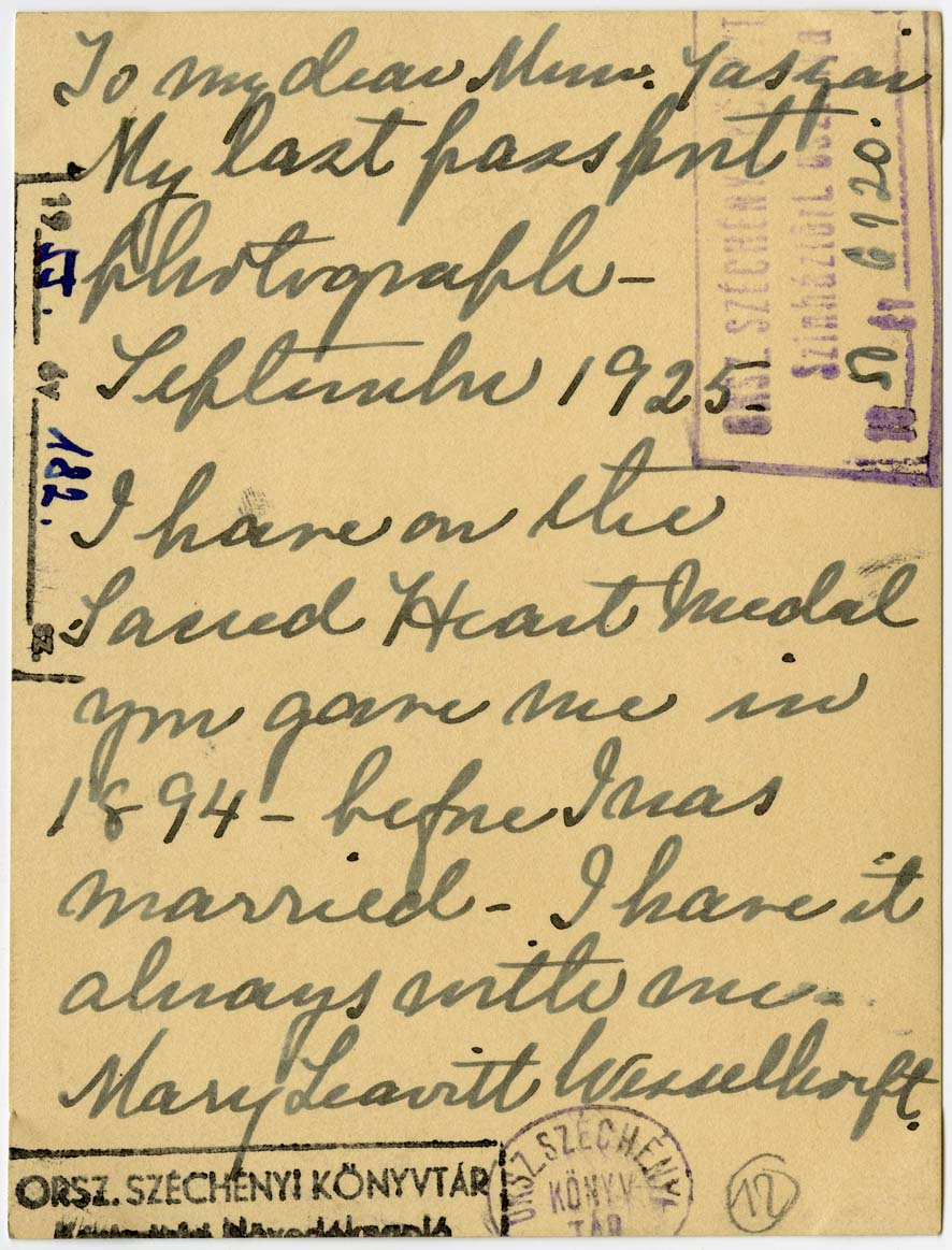 Kézírással: To my dear Mrs. Jaszai. My last passport photograph - September 1925. I have on the Sacred Heart Medal you gave me in 1894 - before I was married - I have it always with me. Mary Leavitt Wesselhoeft. Bélyegző: Orsz. Széchényi-Könyvtár Színháztört. Osztálya 1950. év 6120. sz; Orsz. Széchényi Könyvtár Kézirattári Növedéknapló 1950. év 182. sz.