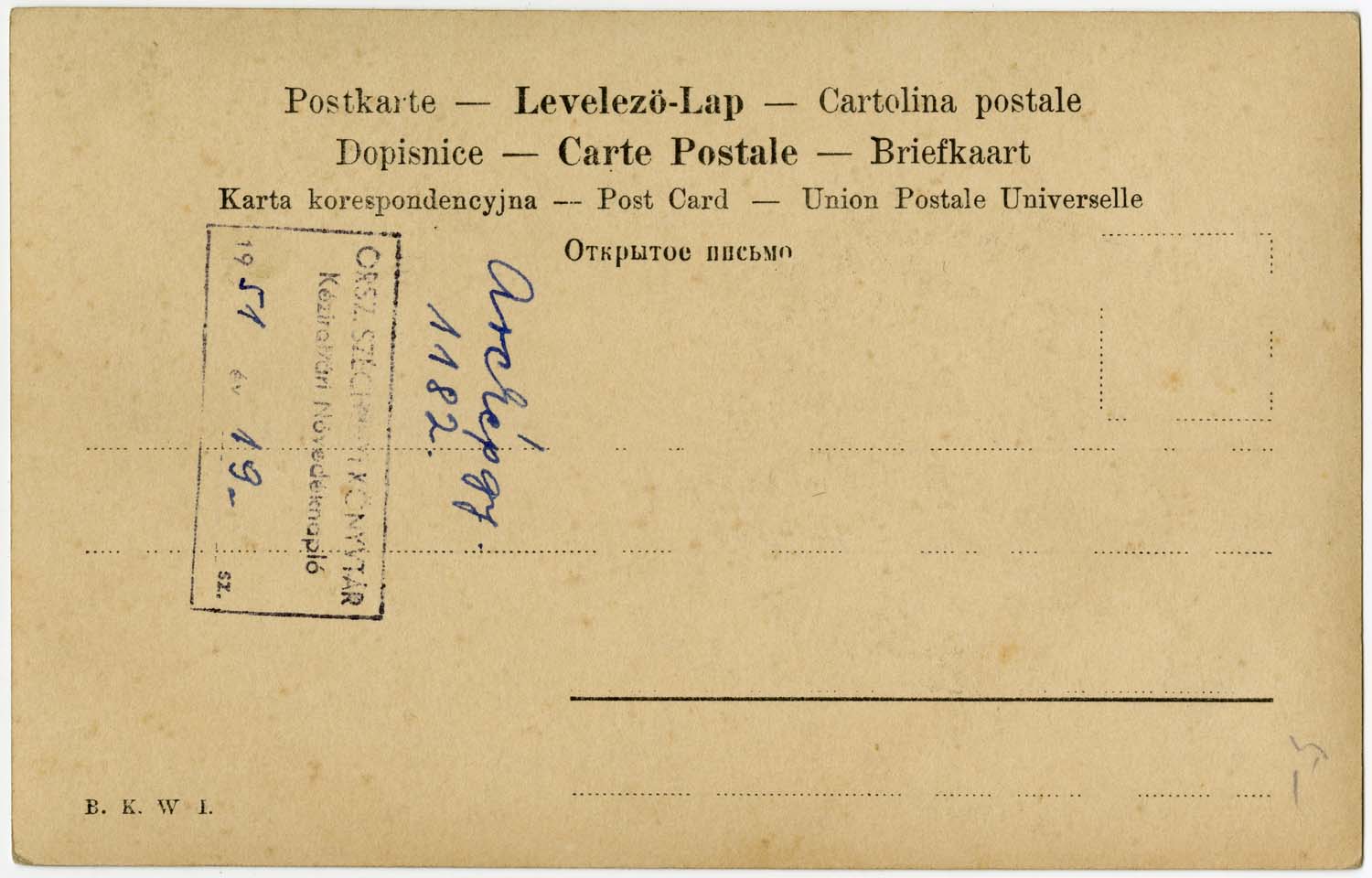 Postkarte - Levelező-Lap - Cartolina postale - Dopisnice - Carte Postale - Briefkaart - Karta korespondencyjna - Post Card - Union Postale Universelle - Oткрытoe письмо. Bélyegző: Orsz. Széchényi-Könyvtár Kézirattári Növedéknapló 1951 év 19. sz.